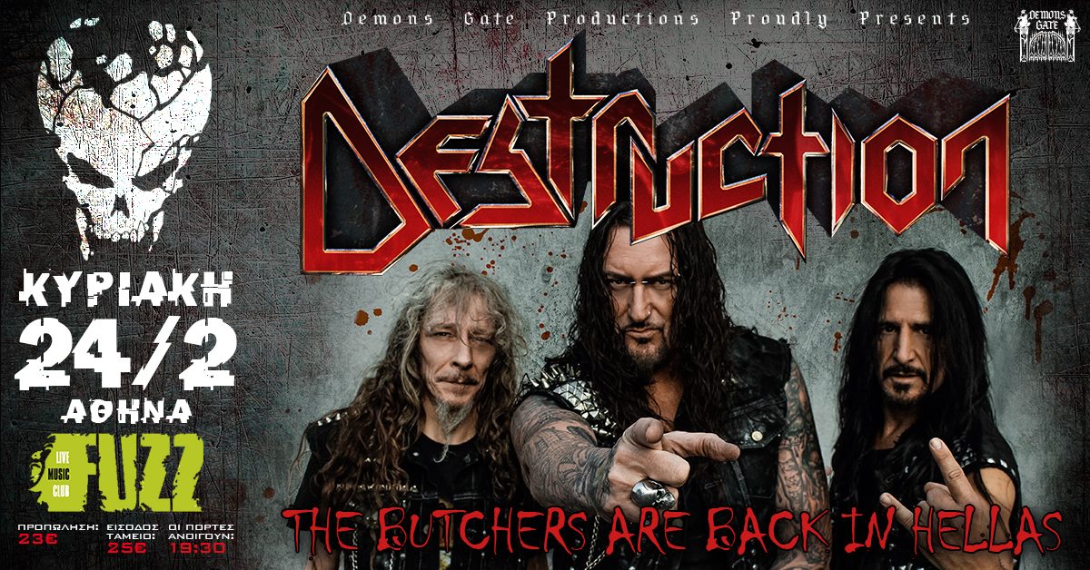 H Demons Gate Productions με υπερηφάνεια ανακοινώνει την επιστροφή μίας μπάντας της Αγίας Τριάδας του Γερμανικού Thrash, τους Destruction, έπειτα από μια απουσία πέντε ετών, με την τελευταία τους εμφάνιση να είναι στο Chania Rock Festival του 2014. Αναμένεται λοιπόν να βρεθούν την Κυριακή 24 Φεβρουαρίου 2019 στο Fuzz Club στην Αθήνα.