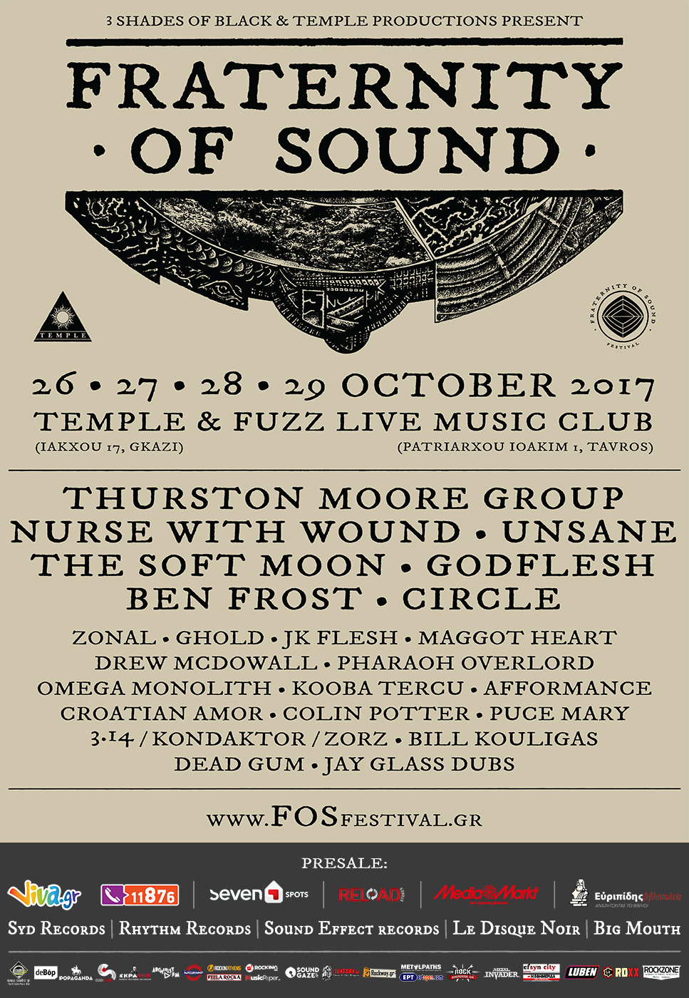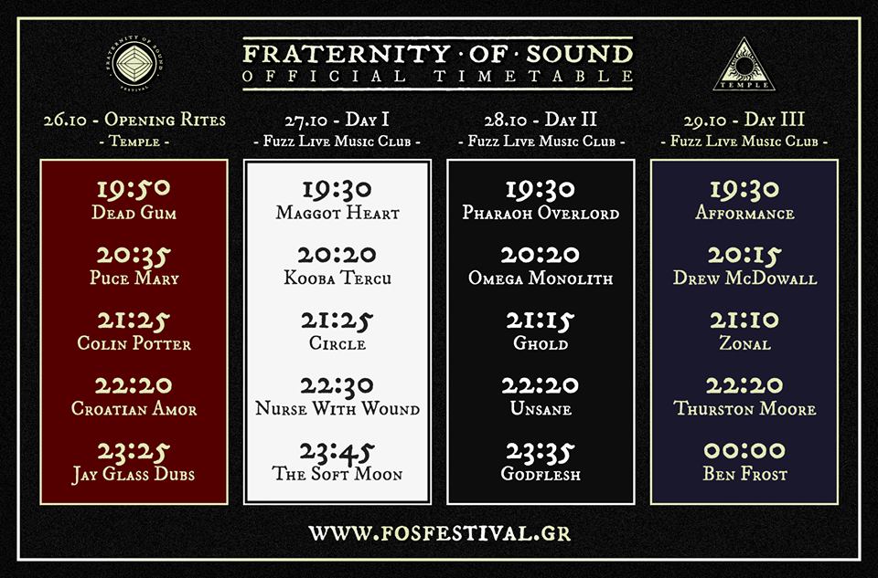 Η Fraternity of Sound, ή αλλιώς FOS, δημιουργήθηκε από την ανάγκη μας για τη βίωση ενός έντονου συναισθήματος. Ενός συναισθήματος που θα μπορούσε να προκληθεί, χάρη σε ένα φεστιβάλ αφιερωμένο σε όλους τους πιστούς του ήχου. Ένα φεστιβάλ που έχει ως βαθύτερο στόχο του να παρουσιάσει καλλιτέχνες και συγκροτήματα που αγνοήθηκαν κατά τη συναυλιακή ιστορία της Ελλάδας, και να τα πλαισιώσει με συνέπεια στο βίωμα και τη βαθύτερη αισθητική που εκφράζουν. Ένα πραγματικό φεστιβάλ, που θα προσπαθήσει να ενώσει διαφορετικά μουσικά είδη, χωρίς να θυσιάσει τίποτα από το ήθος και τη προσωπικότητά του.